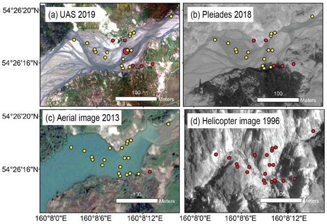 研究团队综合利用直升机航拍(1996、2014年)、三立体Pleiades卫星影像(2018年)和无人机光学/热红外数据(2018、2019年),对间歇泉谷进行厘米级分辨率监测。通过摄影测量技术重建的数字高程模型显示,2018年该区域仍表现为平滑的河床沉积地貌,而2019年数据则捕捉到一个直径7.5米、边缘高0.3米的椭圆形爆炸坑,周围分布着超过150立方米的喷发沉积物。热红外影像显示坑内水体温度接近沸点(96°C),与南侧著名的Bolshoy间歇泉温度相当。通过对比历史影像,研究人员惊人地发现这个新喷发点正是1996年记录的"Malaya Pechka"热液区,该区域在2007年滑坡后被20米厚的碎屑沉积物掩埋长达12年。