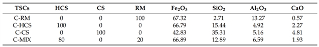在研究过程中,作者先对两种铜渣和赤泥球磨筛分,经过配比后结合传统陶瓷制备工艺进行烧结处理,分别得到不同配方在不同烧成温度下的陶瓷试样。其中C-RM组为赤泥烧成后得到的陶瓷试样,C-HCS为铁含量高的铜渣烧成的陶瓷试样,C-CS为低铁铜渣烧成的陶瓷试样,C-MIX为高铁铜渣与赤泥配比为8:2混合后烧成的陶瓷式样 (表1)。