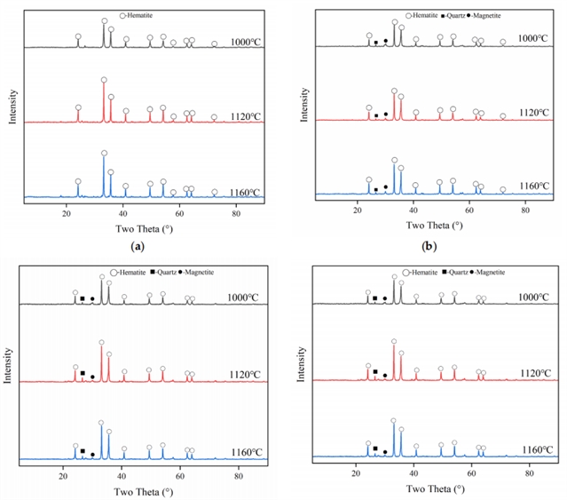 三种原料的XRD图谱如图1所示,烧成后的四组试样的XRD图谱如图2所示,赤泥中的铁主要以三价铁为主,而铜渣中的铁以二价铁为主,烧成过程中,铜渣的二价铁被氧化为三价铁,因此最终烧成的试样矿相以三价铁的赤铁矿为主。
