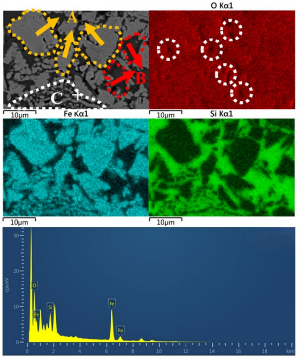 高铁铜渣组陶瓷试样的SEM-EDS能谱如图4所示,该组陶瓷烧成后形成了三个相区,A相区为块状的铁氧化物区域,且具有较大的晶粒尺寸,B相区为硅氧化物区域,C相区为颗粒、条带状区域,形成了一个核-壳结构,铜渣中的铁橄榄石相在烧成过程中被氧化分解为三价铁的赤铁矿 (成为壳) 以及硅氧化物 (成为核)。