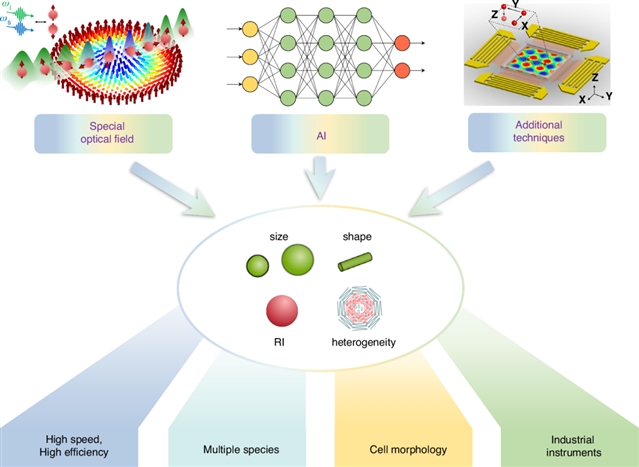 光学分选技术因其高精度、选择性和非接触操作等优势,已经在多个领域得到了广泛应用。然而,当前技术仍面临一些挑战,比如分选速度较慢和处理高浓度样品时存在难度。未来,可以通过设计特殊功能光场、推进 AI 算法以及集成辅助分选技术等,突破当前光学分选方法的极限,实现更快、更高效的多物种分选和细胞形态研究策略(图4)。可以预见,未来将出现越来越多的纳米级精度光学分选原型和仪器,并广泛部署在研究所和医院中,快速处理和分选各种化学颗粒和生物样品,例如药物分子、病毒和外泌体。