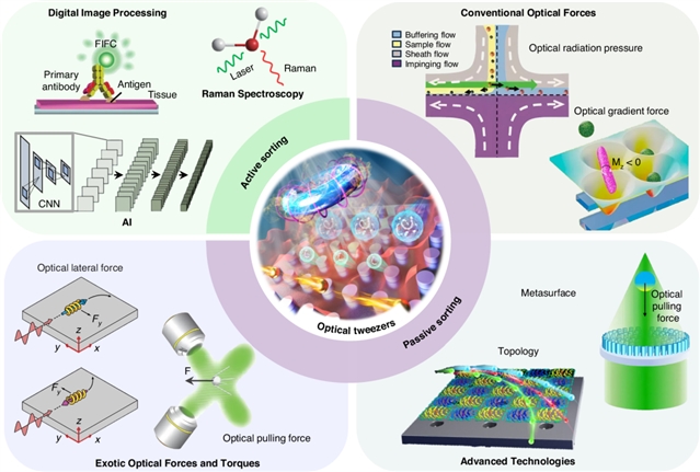 光学分选技术将光力与各种辅助技术集成在一起,包括微流体、人工智能 (AI)、成像过程、免疫测定等。这些技术的整合为颗粒分选提供了更高的效率和精准度。该综述不仅涵盖了各种光力与颗粒属性的原理性关系,还梳理了相关颗粒分选的研究性工作。并且将光学分选技术分为主动光学分选和被动光学分选两种方法,如图1所示。通过对这些现有分选技术的分析,提出了未来研究的方向,为研究人员提供了有价值的研究思路。