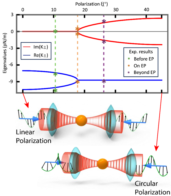 图1. 光操纵单一微粒(光捕获)的奇异点和复数本征模式(理论与量子计算实验)。