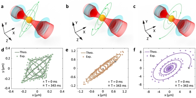 图2. 光捕获单一微粒的运动轨迹(理论与量子计算实验)。(a,d)奇异点前(实数本征模式);(b,e)奇异点上(本征模式合并);(c,f)奇异点后(复数本征模式)。