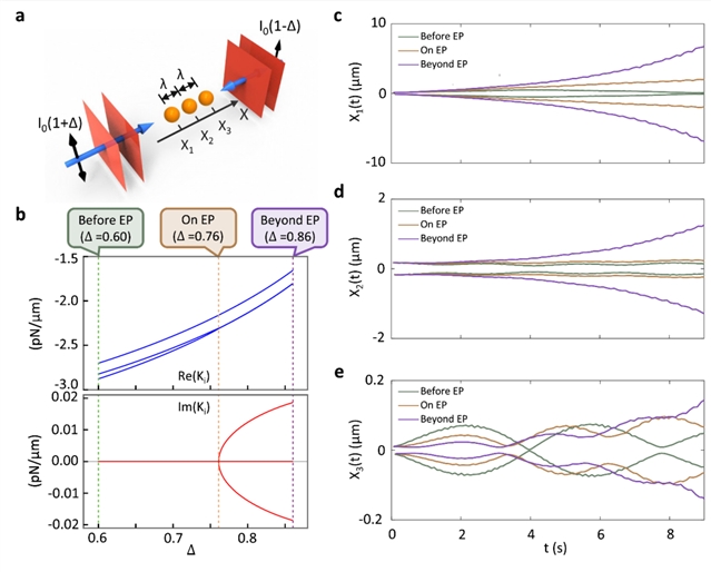 图3. 光束缚多微粒系统的奇异点、复数本征模式、和运动轨迹。(a)利用场强对称性破缺来引入非厄米特性;(b)光束缚多微粒系统的本征模式(出现奇异点和复数本征模式);(c-e)奇异点前、奇异点上、奇异点后的运动轨迹。