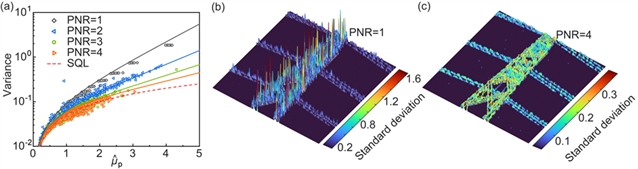 图4. 反射率测量能力研究。(a):不同光子数分辨能力下的估计方差与SQL的对比。(b):PNR=1 detection (on/off detection)估计标准差的空间分布。(b):PNR=4 detection估计标准差的空间分布。