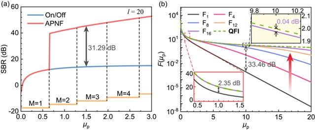图2. 信噪比特性与Fisher信息获取能力。(a):信号背景比(SBR)对比。(b):测量的Fisher信息与量子Fisher信息的对比。