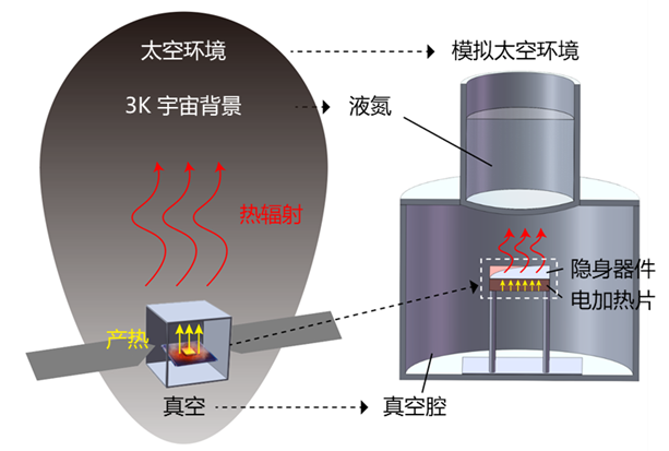 该隐身器件在VLWIR波段的辐射率为0.798,在温度为300 K时理论辐射功率密度可达136.3 W·m-2。该团队进一步通过真空腔和液氮来模拟太空环境(图4),验证隐身器件的辐射散热能力。真空腔内气压为0.15 Pa,在此气压下对流换热相对辐射换热已经可以忽略不计,器件对外散热基本通过辐射实现。用液氮模拟宇宙低温背景,将器件正对液氮进行辐射散热。同时用电加热片对器件进行加热,模拟太空目标运行中捕获或产生的热能。在1200 W·m-2的加热功率下,隐身器件相比作为参照物的金属薄膜热平衡温度下降了39.8 ℃,展现了良好的辐射散热能力,对于稳定太空目标的温度具有重要意义。