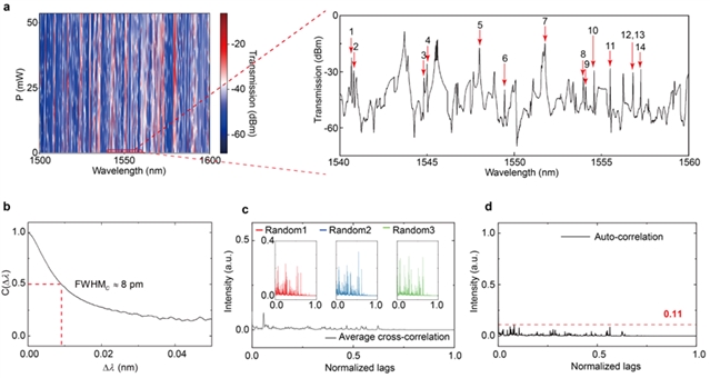 利用多个微盘光子原子之间相互的复杂模式杂化效应,在波长域产生了大量无序和混沌的光子分子轨道。通过对器件进行线性扫描外部加热功率,生成了具有高度无序行为的准随机响应矩阵,如图2.a所示。响应矩阵的列正交性由自相关函数评估,达到~0.1的水平;行相关性由互相关函数评估,达到低于0.1的水平;基于微盘谐振腔和光子分子配置的高Q特性,由相关函数预估的光谱分辨率低至8 pm(图2.b, c, d)。