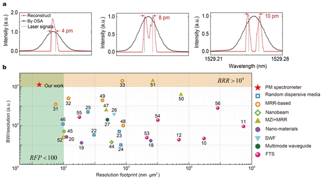 基于高质量的响应矩阵,实验证明了超过100 nm 的宽可测带宽和8 pm的超高光谱分辨率,同时满足了瑞利判据,如图3(a)所示,器件尺寸仅为70×50 μm2。这种高分辨率的实现,得益于光子分子系统中高度无序的锐利共振峰,这些共振峰提供了丰富的光谱信息,使得设备能够分辨非常接近的光谱线。器件性能和其他片上光谱仪的对比展示在图3(b),达成了创纪录的超低低分辨率和尺寸值乘积这一性能指标,和高达12500的带宽/分辨率指标。
