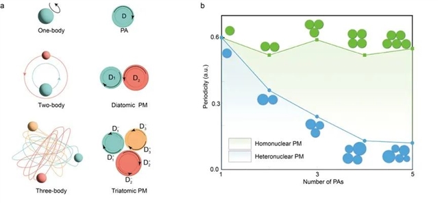 图1. (a) 一体、二体和三体引力系统,以及相应的、类似的光子原子或分子系统;(b) 周期性关于同核和异核光子分子中光子原子数量的函数。