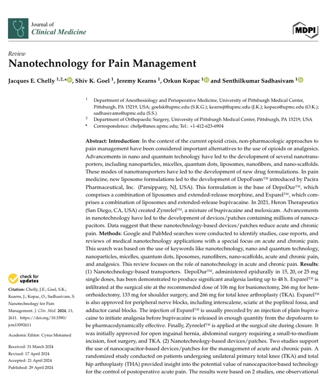 本综述系统总结了纳米技术在疼痛管理中的最新应用进展。当前,脂质体等纳米递送系统 (如DepoDur™、Exparel™、Zynrelef™) 正被广泛用于延长局部麻醉药效、提升镇痛安全性。此外,新兴的非药物性纳米贴片 (如NeuroCuple™、Kailo™) 也初步展现出减轻术后疼痛、减少阿片使用的治疗潜力。