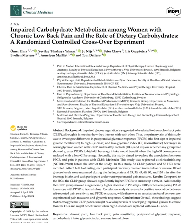 该研究通过随机交叉对照试验发现,与健康女性相比,慢性腰痛女性患者在摄入高血糖指数饮料后表现出更高的餐后血糖反应;将高血糖指数饮料替换为低血糖指数饮料后显著降低了其餐后血糖峰值。此外,该研究发现疼痛敏感性与餐后血糖反应呈正相关,表明慢性腰痛女性患者可通过调整饮食的血糖指数中获益。