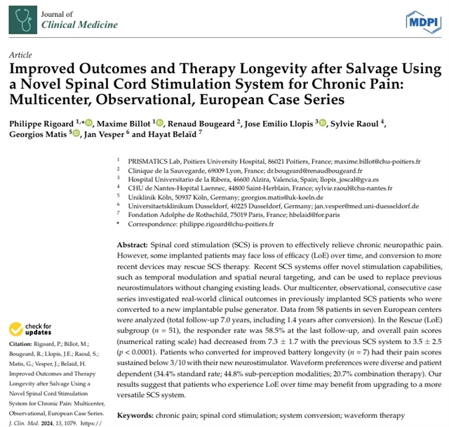 这项欧洲多中心观察性病例系列研究评估了一种新型脊髓刺激系统在慢性疼痛患者中的疗效。结果显示,该系统在缓解疼痛、改善生活质量和延长疗效持续时间方面表现出积极效果,尤其在接受传统治疗无效的患者中更为显著。