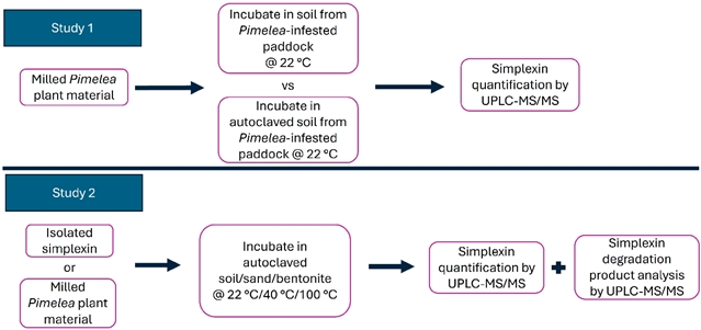 1.微生物代谢验证实验:将粉碎的P. trichostachya植物材料与Pimelea污染牧场采集的土壤混合,在22°C下培养7天,监测simplexin含量变化。