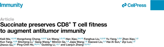 2025年8月14日,中国医学科学院系统医学研究院/苏州系统医学研究所(以下简称“系统所”)张连军团队、李贵登团队、顾志敏团队与瑞士洛桑大学Ping-Chih Ho团队合作在Immunity期刊在线发表题为“Succinate preserves CD8+ T cell fitness to augment anti-tumor immunity”的研究论文。该研究发现三羧酸循环代谢中间物琥珀酸,可通过激活线粒体自噬与表观遗传重塑,显著增强CD8+T细胞存活、干性维持及持久抗肿瘤能力,为提升免疫治疗疗效提供了全新的代谢干预靶点。