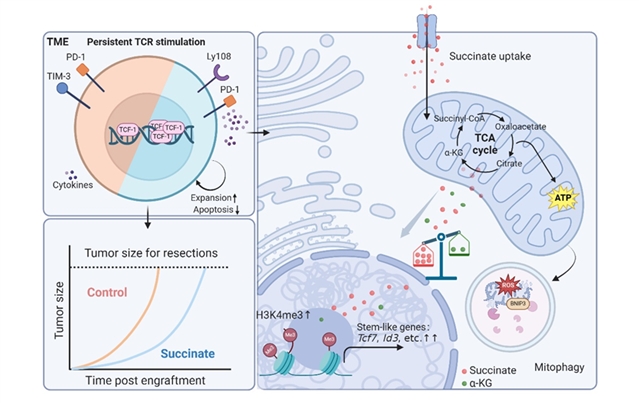 肿瘤浸润CD8+T细胞经受持续性抗原刺激导致功能耗竭,表现为自我更新能力丧失、线粒体代谢受损及表观遗传固化。其中,具有干细胞特性的TCF-1+T细胞亚群(Tpex)是免疫治疗的核心应答群体,其数量与患者生存期显著正相关。然而,如何维持T细胞干性仍是领域内重大挑战。近年研究发现,三羧酸循环(TCA)衍生代谢物浓度的波动深刻影响T细胞的分化轨迹。琥珀酸是三羧酸循环(TCA)中的重要中间代谢物,在携带琥珀酸脱氢酶(SDH)突变的肿瘤中大量累积,但目前琥珀酸在CD8+T细胞介导的抗肿瘤免疫应答中的作用仍存在较大争议,其是否直接调控T细胞分化尚不清楚。