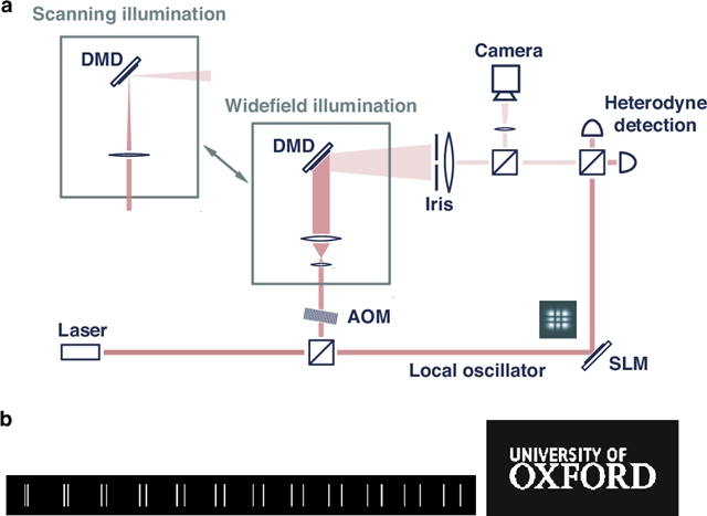 图1. (a) 用于在宽场和聚焦扫描照明下比较直接成像(DI)和厄米 - 高斯成像(HGI)的光学装置。(b) 显示在数字微镜器件(DMD)上用于分辨率估计的位图:牛津大学校徽以及间距从 20 到 130 个 DMD 像素不等的线对。