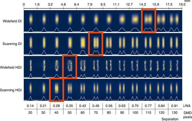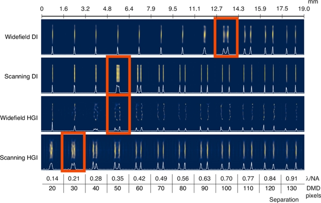 图2. 在宽场和聚焦扫描照明下,使用直接成像(DI)和厄米 - 高斯成像(HGI)对间距逐渐变化的线对进行成像。白线表示线对在任意强度单位下的一维轮廓。