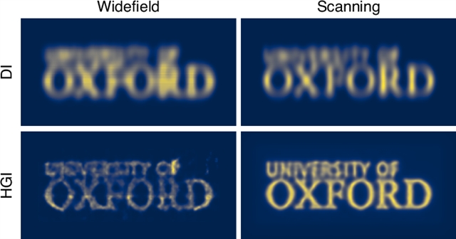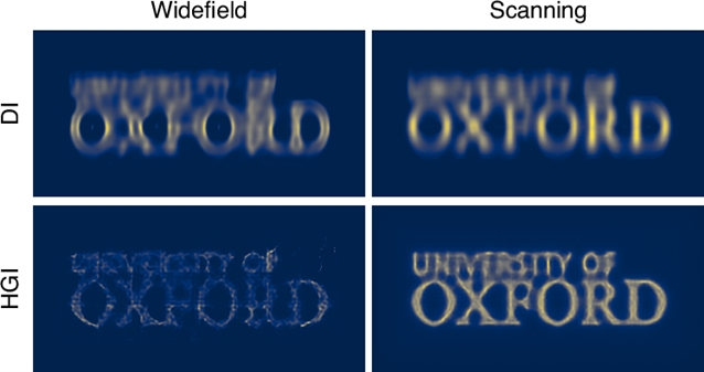 图3. 在宽场和聚焦扫描照明下,使用直接成像(DI)和厄米 - 高斯成像(HGI)对牛津大学校徽进行成像。