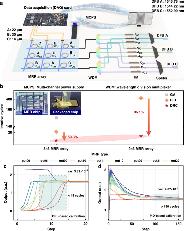 图2(a)展示了基于微环阵列芯片的多波长系统,由于微环制作工艺不够理想,不同微环响应存在一定的偏差。基于DRC方法控制微环阵列的电压,能够使其迅速达到期望响应状态。图2(b)展示了在使用不同微环阵列时不同算法的校准迭代周期,DRC方法性能远超其他方法。图2(c)和(d)分别展示了基于DRC方法校准和PID方法校准过程中不同通道输出的结果,DRC方法迭代的周期更短,且不同微环之间响应的误差更低。