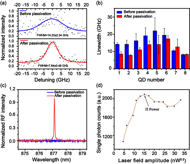 图2. 表面钝化对单个量子点共振荧光的提升。(a) 单个量子点的共振荧光线宽在钝化后变窄;(b) 本来存在的共振荧光线宽在钝化后普遍变窄;(c) 本来消失的共振荧光在钝化后得以恢复;(d) 恢复后的共振荧光强度随光强的平方根变化呈现振荡。