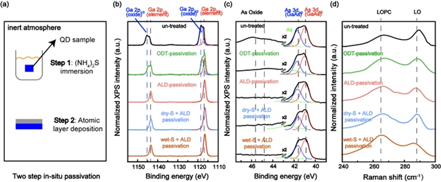 图1. (a) 两步原位钝化技术过程示意图;(b)-(d)分别对应四种钝化工艺处理后GaAs表面 (b) Ga 2p的X射线光电子能谱图;(c) As 3d的X射线光电子能谱图;(d) 拉曼光谱图。