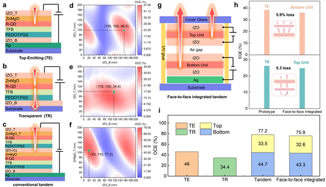 图1. 面对面集成的叠层QLED的光学性能分析。