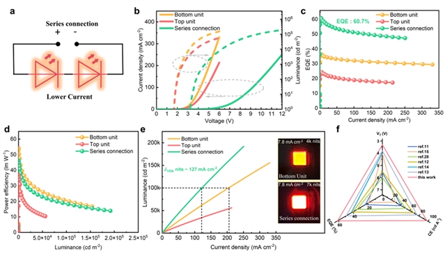 图2. 串联模式的叠层QLED的性能表现。
