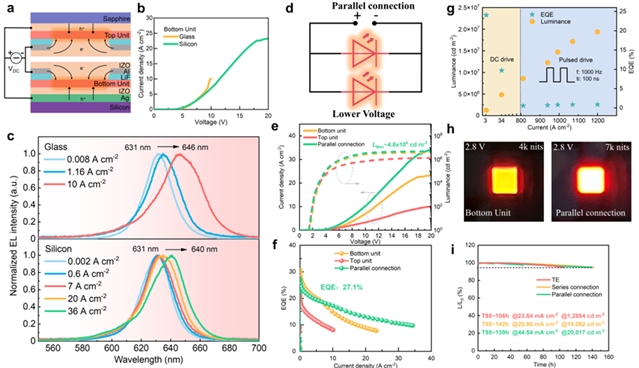 图3. 并联模式的叠层QLED的性能表现。