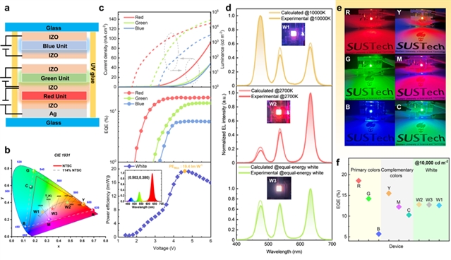 图4a展示的结构创新性地红、绿、蓝三原色QLED单元垂直集成,且各单元可独立驱动,从而实现对颜色、亮度及色温的精确调节。结合光谱拟合与色度反演方法,团队可在预设色坐标下精准匹配RGB子单元驱动电压,实现114% NTSC的超广色域覆盖。如图4d所示,得到的器件白光光谱与预测的光谱非常吻合,说明这种调节模式的可靠性。这种结构在智能照明、个性化氛围光等场景中展现出强大的可拓展性。