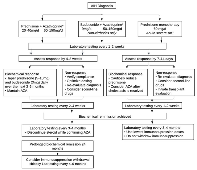 大多数新诊断的AIH患者都需要治疗。治疗指征包括肝酶升高、肝活检显示活动性肝炎或炎症性肝硬化,或肝酶超过正常上限两倍并伴有症状或高胆红素血症。初始治疗目标是诱导缓解,标准为:肝酶(转氨酶和胆红素)恢复正常、血清丙种球蛋白水平正常化、临床症状消失,以及肝组织学炎症改善。一线治疗推荐免疫抑制疗法,可选择单用皮质类固醇或低剂量皮质类固醇联合硫唑嘌呤。2019年AASLD指南建议成人泼尼松单药剂量40-60 mg/天,或与硫唑嘌呤联用时降至20-40 mg/天;部分医疗中心采用1 mg/kg起始剂量,待反应良好后减量。2015年EASL指南推荐初始剂量0.5-1 mg/kg/天泼尼松,随后过渡至50 mg/天硫唑嘌呤。若4-8周后生化指标改善,可逐步减少类固醇,缓解后可尝试停药。若缓解维持12-24个月,可考虑停用硫唑嘌呤(如有使用)。治疗反应存在个体差异,部分患者在7-14天内出现早期应答,而部分需8周以上才显现。获得缓解的患者生存率与普通人群相近,且缓解维持时间越长,总体生存率越高。