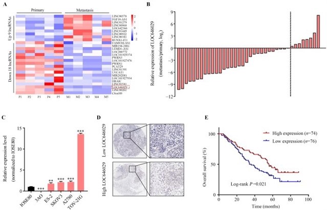 研究团队首先通过RNA测序技术分析了5对卵巢癌原发灶与转移灶组织中的lncRNA表达谱,发现LOC646029在转移灶中的表达较原发灶显著下调,这一结果在后续38对组织样本的实时荧光定量PCR验证中得到确认——超过78.9%的转移灶样本中LOC646029表达低于对应的原发灶。进一步分析卵巢癌细胞系及正常卵巢上皮细胞系IOSE80的表达水平发现,除3AO细胞外,多数卵巢癌细胞系中LOC646029表达高于正常细胞,提示其可能与肿瘤进展阶段相关。对150例卵巢癌患者的原位杂交(ISH)分析显示,LOC646029低表达与患者预后不良显著相关,初步提示其可能作为潜在的预后标志物(图1)。