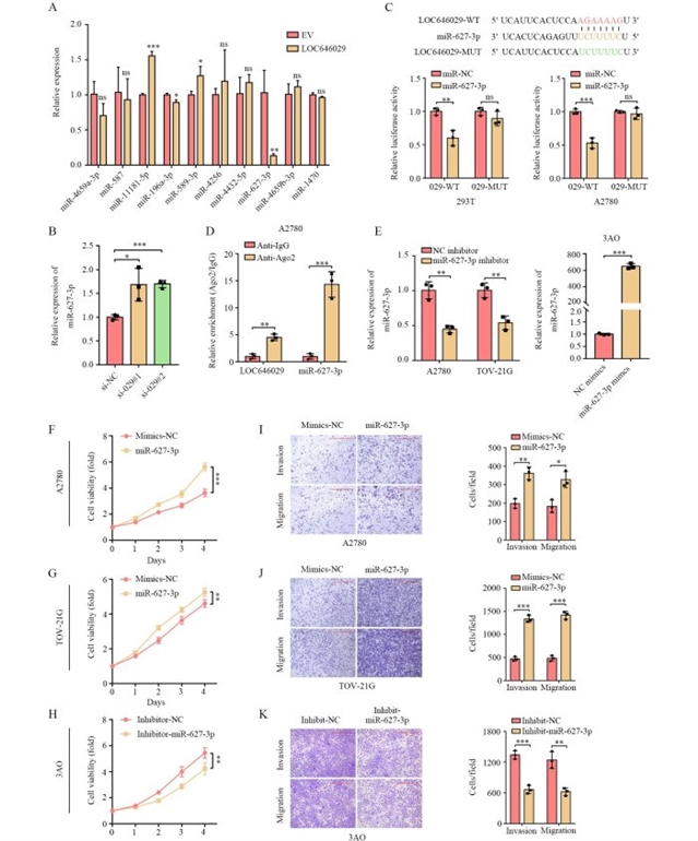 机制探索方面,研究团队首先通过荧光原位杂交(FISH)和核质分离实验确认LOC646029主要定位于细胞质,提示其可能通过“分子海绵”机制调控miRNA功能。利用生物信息学工具预测并验证后,发现miR-627-3p是LOC646029的直接结合靶点:过表达LOC646029可显著降低miR-627-3p表达,敲低LOC646029则上调miR-627-3p水平;双荧光素酶报告实验证实,miR-627-3p与LOC646029的野生型序列结合可显著降低荧光素酶活性,而突变结合位点后这一效应消失;RNA免疫沉淀(RIP)实验进一步验证了LOC646029、miR-627-3p与Argonaute-2(AGO2)蛋白的共沉淀,支持二者通过RNA诱导沉默复合体(RISC)相互作用。功能实验显示,过表达miR-627-3p可促进卵巢癌细胞增殖、侵袭和迁移,敲低miR-627-3p则抑制这些恶性表型(图3),与LOC646029的作用相反。