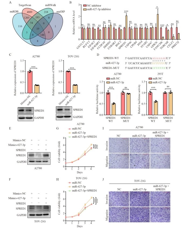 图4 SPRED1是miR-627-3p的关键下游靶标,可抑制卵巢癌细胞的增殖、侵袭和迁移