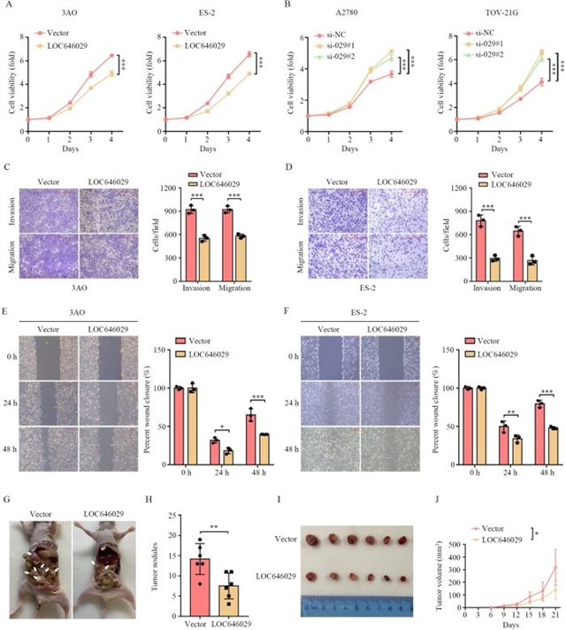 图2 LOC646029作为抑癌因子,在体内外抑制卵巢癌细胞的增殖和转移