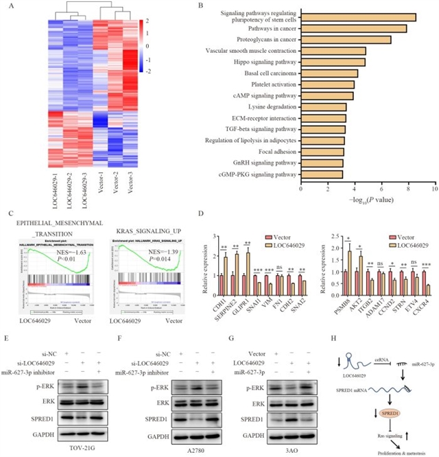 图6 LOC646029/miR-627-3p/SPRED1轴通过抑制Ras信号通路抑制卵巢癌细胞的进展