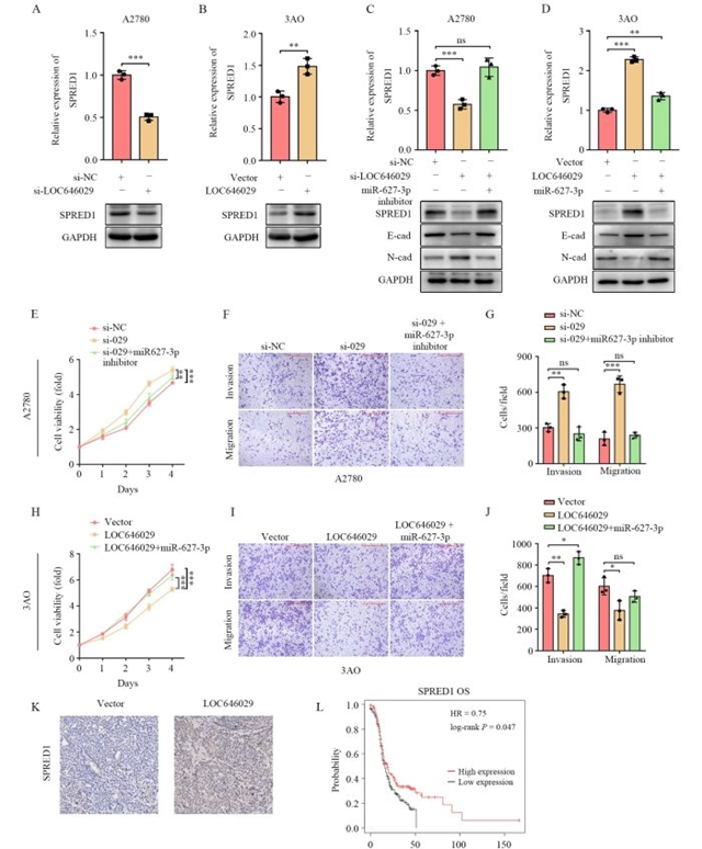 在此基础上,研究团队证实LOC646029通过“海绵”吸附miR-627-3p,解除后者对SPRED1的抑制,从而上调SPRED1表达。敲低LOC646029导致SPRED1表达下降,而miR-627-3p抑制剂可逆转这一效应;过表达LOC646029上调SPRED1表达,miR-627-3p模拟物则部分抵消该作用。功能实验显示,miR-627-3p抑制剂可缓解LOC646029敲低引起的增殖和侵袭能力增强,miR-627-3p模拟物则削弱LOC646029过表达的抑制效应。此外,LOC646029过表达的裸鼠移植瘤中SPRED1表达显著高于对照组,且TCGA数据库分析显示SPRED1低表达与卵巢癌患者预后不良相关(图5)。
