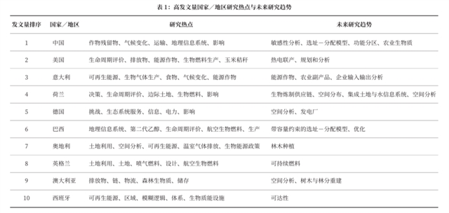 研究进一步细化全球生物质能领域的研究特点,选择发文量前十的国家和地区,分别提取中介中心性最高的五个关键词为研究热点,提取持续出现的聚类主题为未来研究趋势(表1)。