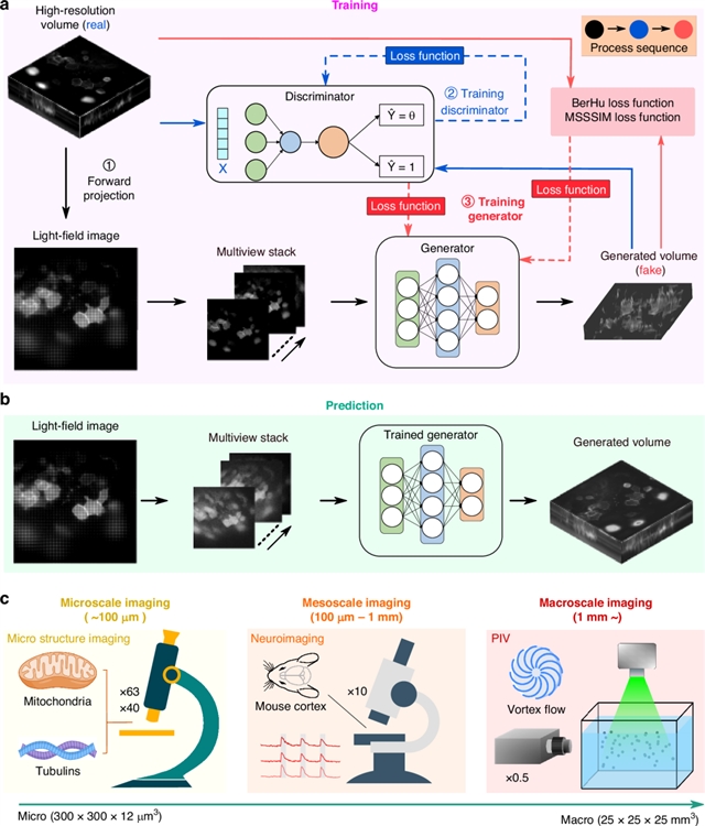 图1. (a) RTU-Net 训练程序的简化示意图;(b)预测的 RTU-Net 的过程;(c) 不同尺度下RTU-Net的成像情况:微观尺度上线粒体和微管蛋白的结构成像(左);中尺度的大鼠大脑的神经成像(中);宏观尺度颗粒成像(右)。