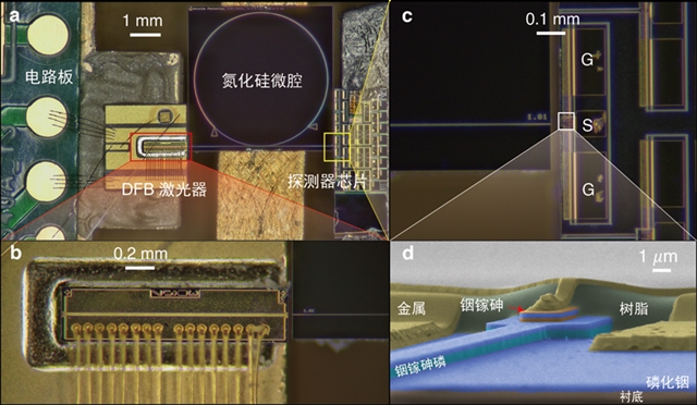 图1. 混合集成微波振荡器芯片及分立元件。(a) 包含印刷电路板、DFB激光器芯片、氮化硅微腔芯片和高速探测器芯片的整体器件图;(b) DFB激光器芯片的放大图;(c) 探测器芯片上单个探测单元;(d) 探测器内部结构的扫描电镜图。