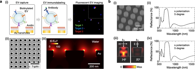 在生物医学检测领域,研究团队成功构建了基于电介质与等离子体超表面的无标记EVs分析平台,通过优化纳米光子结构与生物分子的场相互作用,实现了EVs检测灵敏度的突破性提升。结合干涉散射显微镜与表面增强荧光技术,该平台成功实现单个EVs的尺寸、折射率及膜蛋白标志物的同步多参数成像,为肿瘤液态活检提供了高信息量的检测方案。