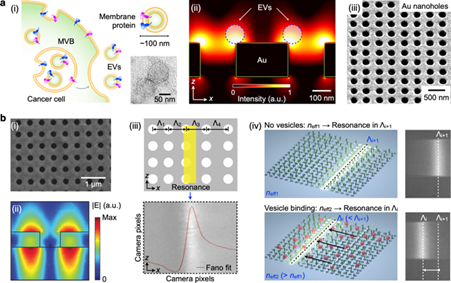 随着精准医疗的快速发展,传统生物标记检测技术面临检测灵敏度低、操作复杂等挑战。在此背景下,基于纳米光子学的无标记检测技术因其高灵敏度、实时分析和无需标记等优势成为研究热点。近日,哈佛医学院研究团队通过创新设计电介质和等离子体超表面结构,成功实现了细胞外囊泡(EVs)的高灵敏度检测与成像。该研究通过优化共振模式与分析物的场重叠,显著提升了检测能力,其中电介质纳米孔阵列对EVs的检测灵敏度达到103EV/mL,较传统酶联免疫吸附技术提高了两个数量级,为疾病早期诊断提供了关键技术支撑。该研究成果以"Nanophotonic sensing and label-free imaging of extracellular vesicles"为题发表于国际权威期刊《Light: Science & Applications》,Isabel Barth为论文的第一作者,Isabel Barth和Hakho Lee为论文的共同通信作者。