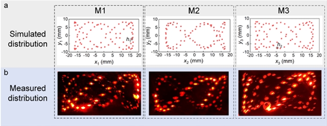 图2. 三片镜光斑图案: (a)仿真光斑分布;(b)实测光斑分布。图源: Light: Science & Applications