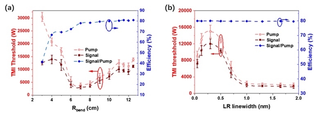 图2. 理论仿真的少模光纤激光振荡器模式不稳定阈值(a)随弯曲盘绕半径变化,(b)随LR线宽变化。