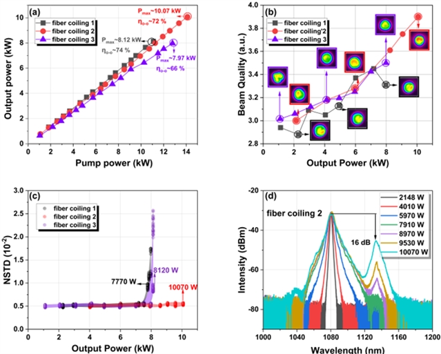 在实验研究中,团队采用30/600 μm的掺镱光纤(YDF)和飞秒激光掩膜板刻写的光纤光栅构建了全光纤激光振荡器(如图3)。通过精确控制光纤光栅的中心波长及线宽,结合对掺镱光纤弯曲盘绕方式的优化,成功将少模光纤激光振荡器的TMI阈值提升至10 kW以上,不同盘绕半径下全光纤振荡器输出激光特性见图4。