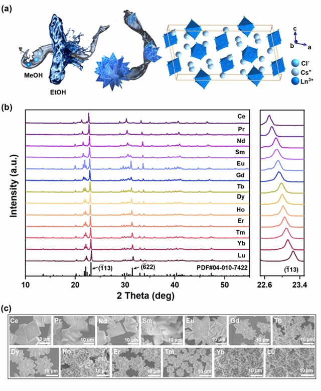 图1. (a) Cs3LnCl6微晶的合成过程示意图和晶体晶胞结构。(b) Cs3LnCl6微晶的粉末XRD图和(c)SEM图。