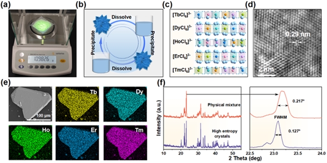 图2. (a) 大规模合成的Cs3TbCl6微晶在365 nm紫外灯照射下的照片。(b) Cs3TbCl6晶体循环可回收性示意图。(c) 高熵Cs3{TbDyHoErTm}1Cl6晶体的示意图。高熵Cs3{TbDyHoErTm}1Cl6晶体的(d)HRTEM图像和(e)SEM元素面扫描。(f) 高熵Cs3{TbDyHoErTm}1Cl6晶体及相关的Cs3TbCl6、Cs3DyCl6、Cs3HoCl6、Cs3ErCl6和Cs3TmCl6物理混合物的粉末XRD和精扫XRD图。