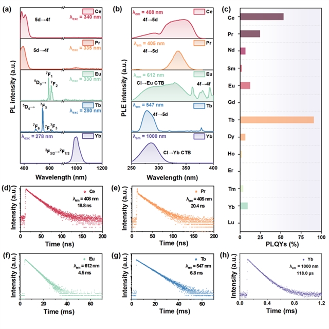 图3. Cs3CeCl6、Cs3PrCl6、Cs3EuCl6、Cs3TbCl6和Cs3YbCl6微晶的(a)发射光谱和(b)激发光谱。(c) Cs3LnCl6微晶的PLQY。(d)Cs3CeCl6、(e)Cs3PrCl6、(f)Cs3EuCl6、(g)Cs3TbCl6和(h)Cs3YbCl6的荧光衰减曲线。