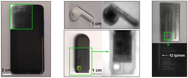 图5. 基于Cs3TbCl6@PDMS薄膜作为闪烁荧光屏,对智能手机、蓝牙耳机、无线网络适配器以及标准分辨率测试卡片进行X射线成像测试的照片。